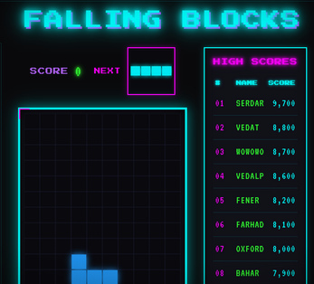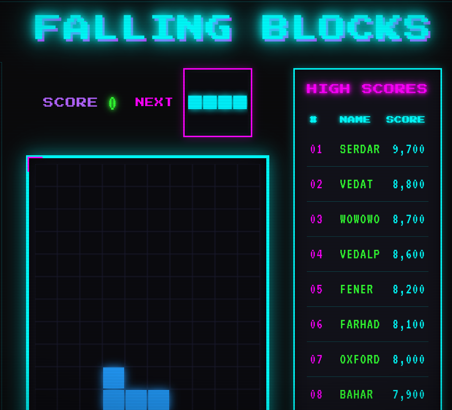 blocks fall from the top of the grid, and your goal is to stack them efficiently to clear lines and score as many points as possible. As the game progresses, the speed increases and the challenge ramps up.